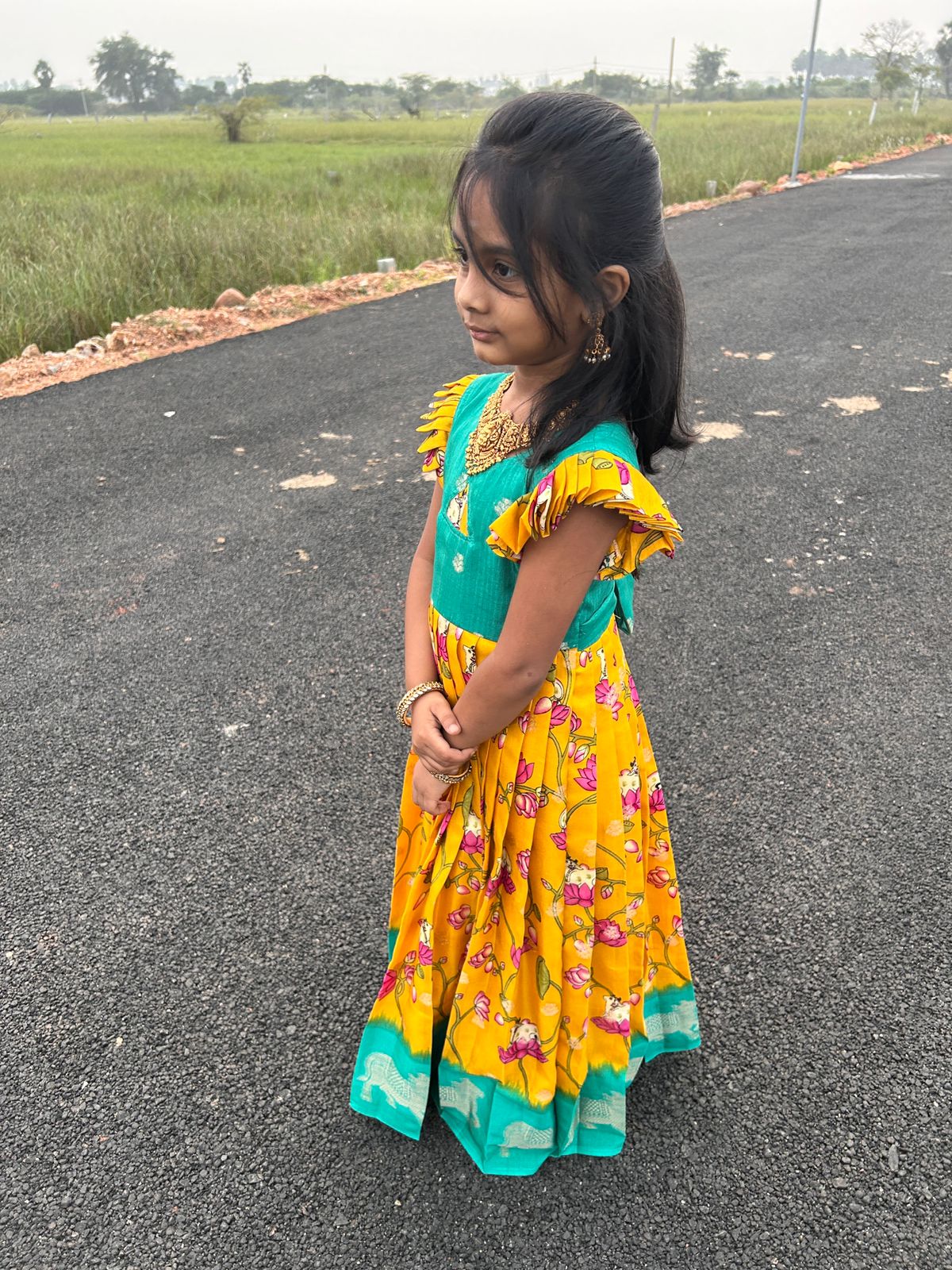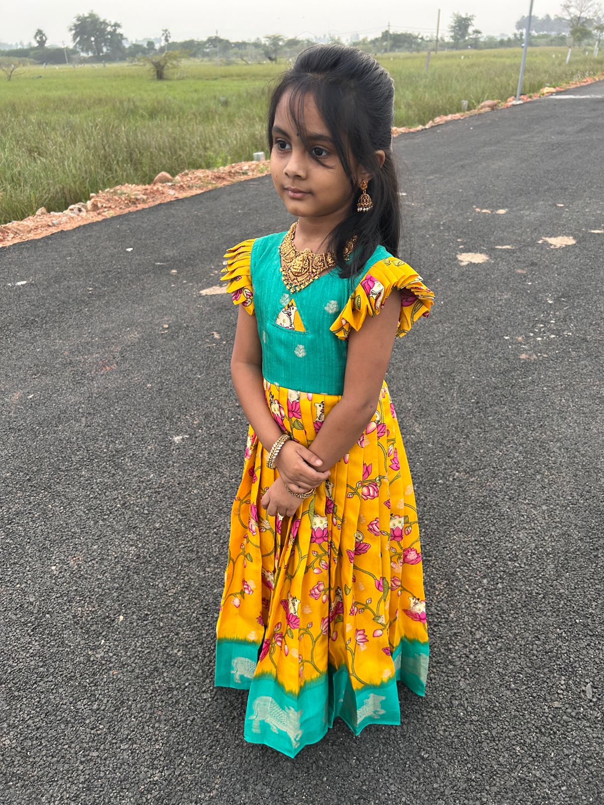 (MAX01) Yellow with Green Kids Maxi with Pitchaiwai and Lotus Prints