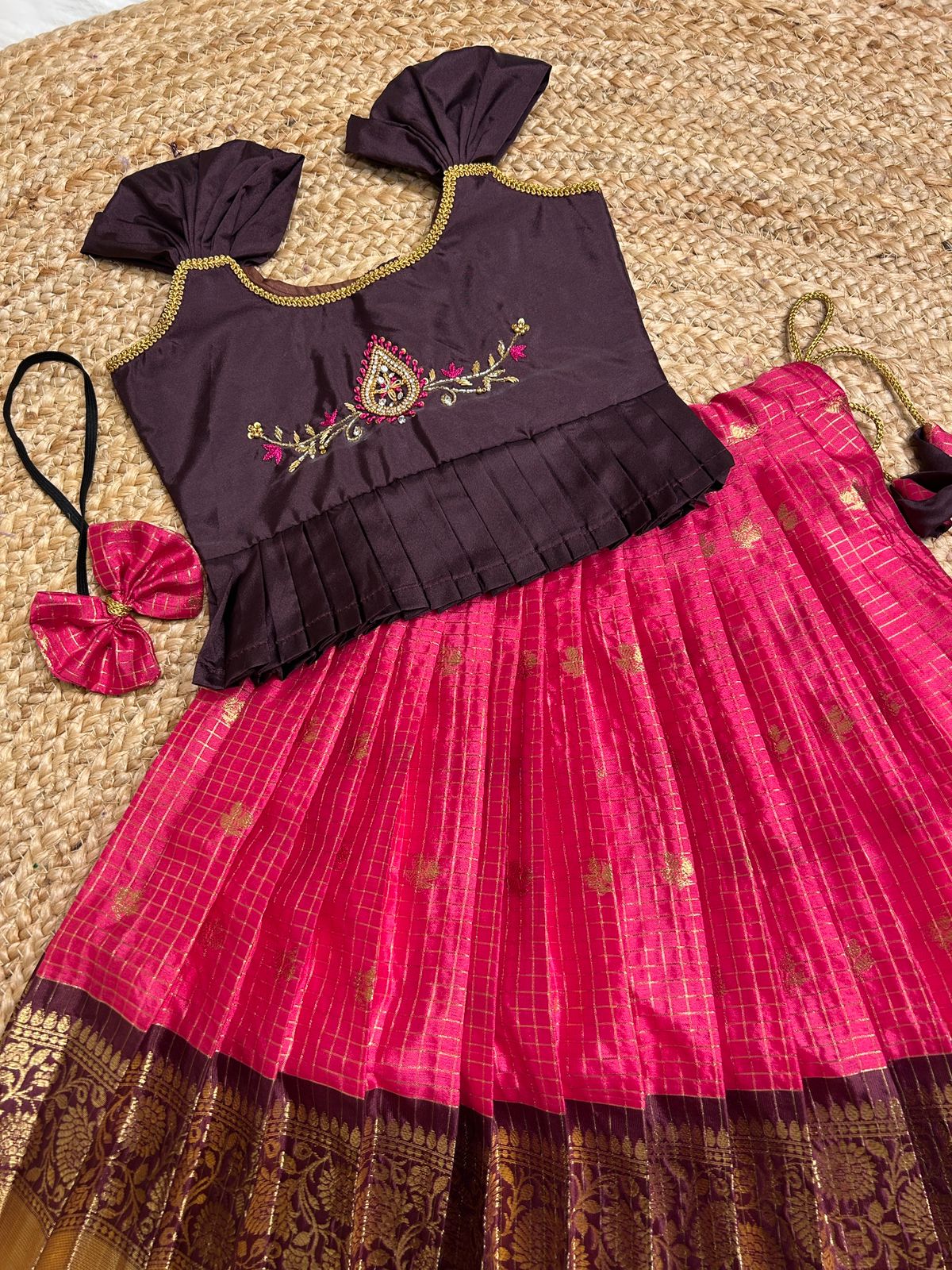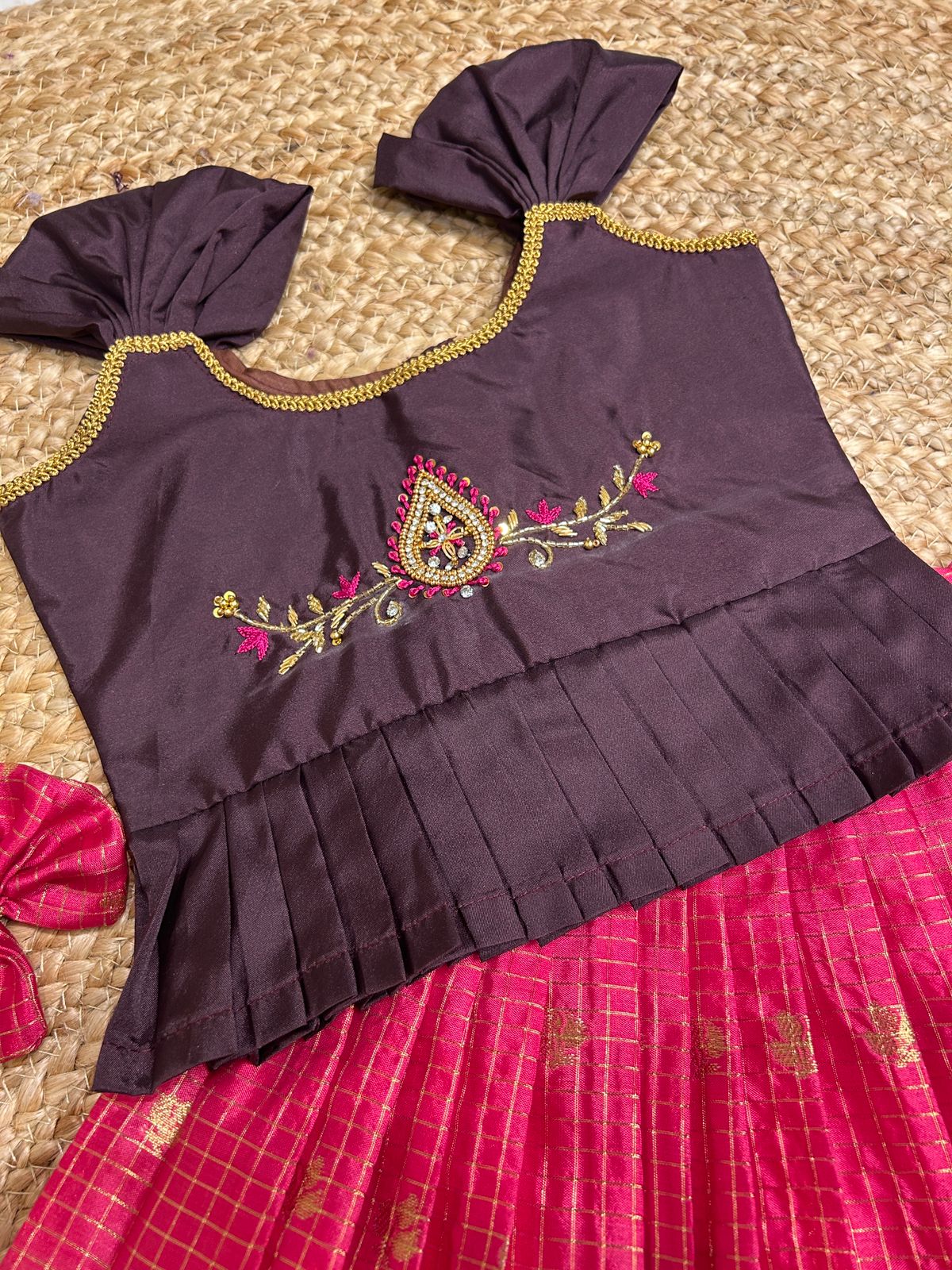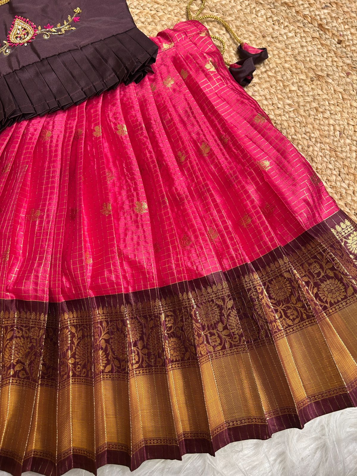 (SB428)Sevanthi - Rose with Brown Kanchipuram Patta Border Pattu Pavadai Sattai