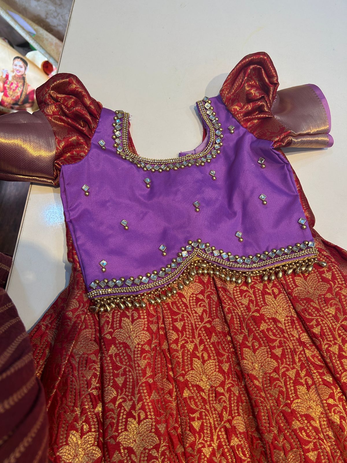 (SB448)Diwali Dress - Red Paired with Lavender Pattu Border with Zimkana Worked Tops