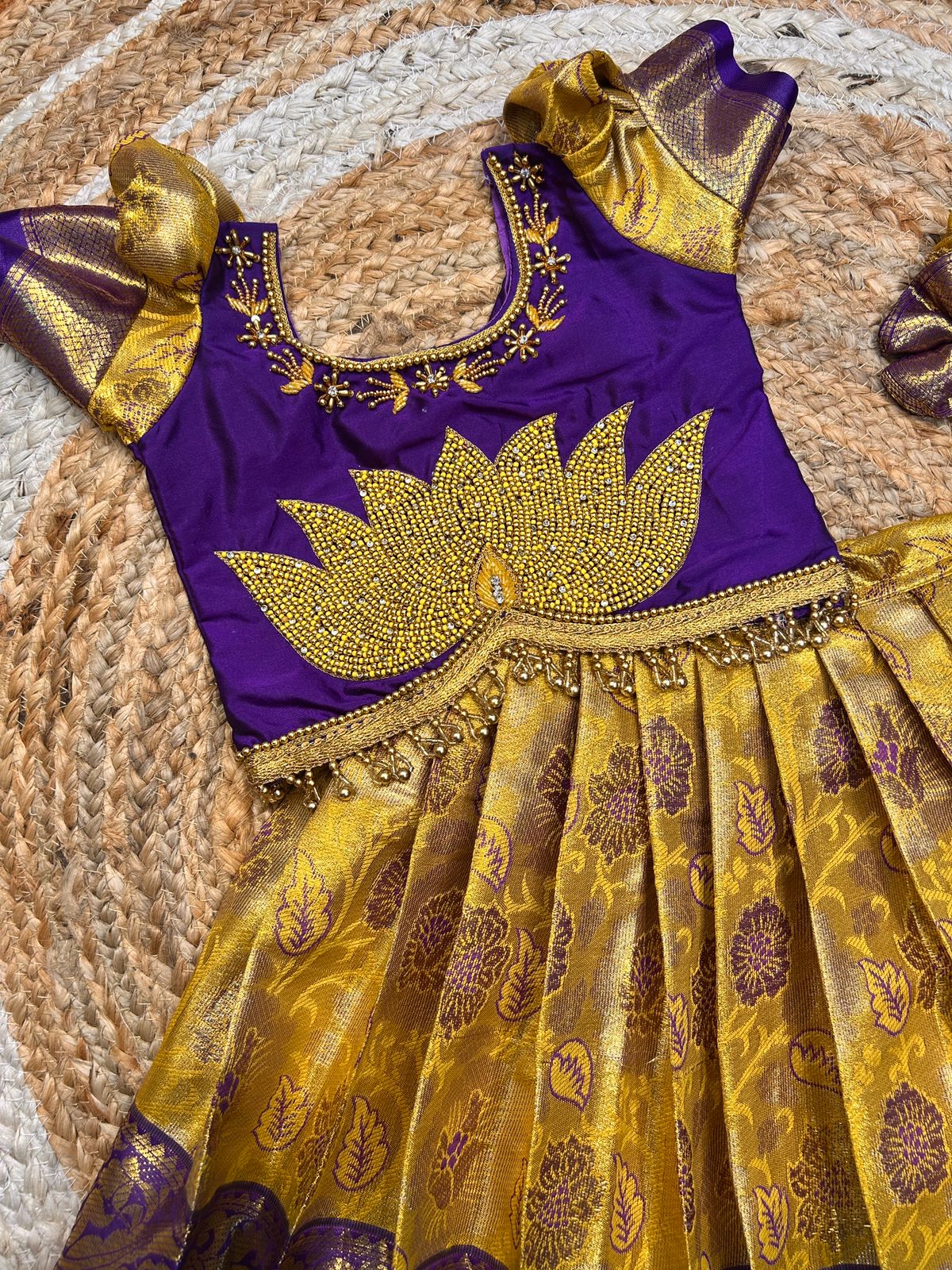 (SB489)Citroni - Lemon Yellow with Purple Originally Aari Worked Lotus Silk Lehenga